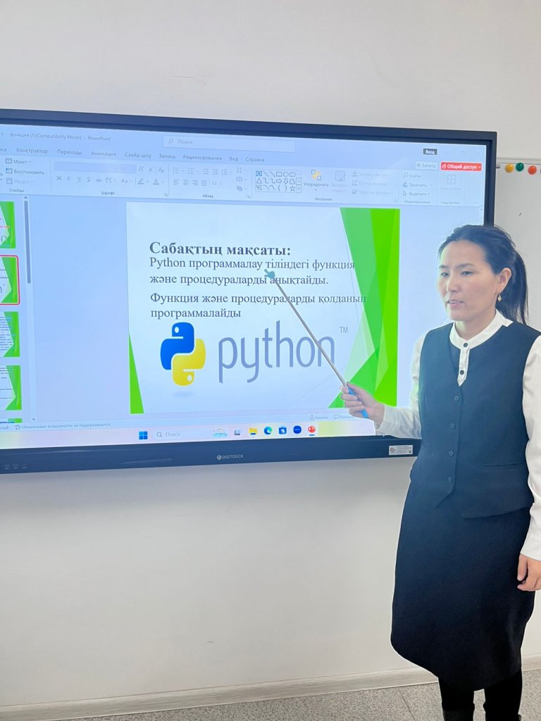 Бүгін, 3 желтоқсан күні, "Тірек мектеп" жобасы аясында 10-сыныпта информатика пәнінен «Python бағдарламасында жолдарды өңдеу үшін пайдаланылатын процедуралар мен функциялар» тақырыбында онлайн сабақ өтті.