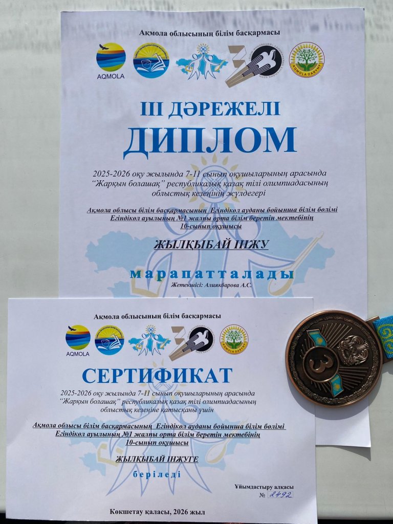 2025 - 2026 оқу жылында 7-11 сынып оқушыларының арасында " Жарқын болашақ" республикалық қазақ тілі олимпиадасының облыстық кезеңіне мектебіміздің 10-сынып оқушысы Жылқыбай Інжу қатысып, жүлделі 3 - орынды иеленді. Жеңісің құтты болсын!