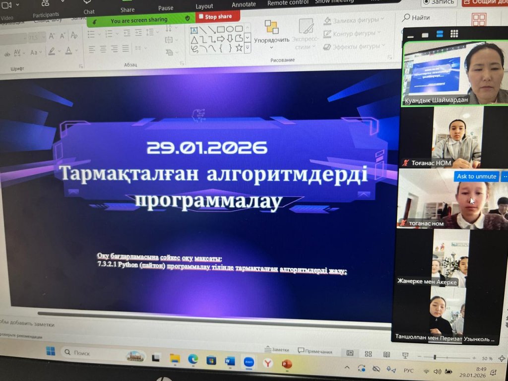 29 қаңтар 2026 жылы 7 сыныпта информатика пәнінен “Тармақталған алгоритмдерді программалау” тақырыбында онлайн сабақ өтті. Сабақтың мақсаты: “Python программалау тілінде тармақталған алгоритмді жазу....