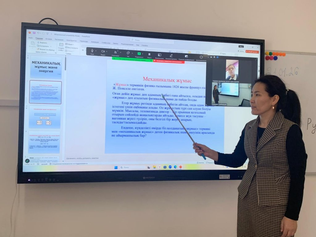 21 қаңтар 2026 жылы “ Ауыл мектебі - сапа алаңы” тірек мектебі жобасы аясында 9 сыныпта физика пәнінен “Механикалық жұмыс және энергия” тақырыбында онлайн сабақ өтті.
