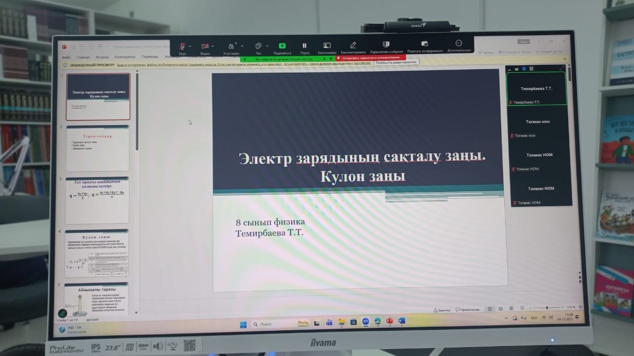 Бүгін, 04.12.2025 ж. күні, 8 сыныпта физика пәнінен "Электр зарядының сақталу заңы. Кулон заңы" тақырыбында онлайн сабақ өтті.
