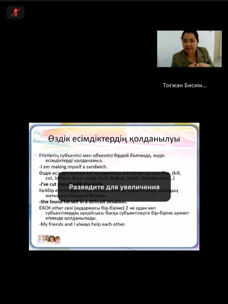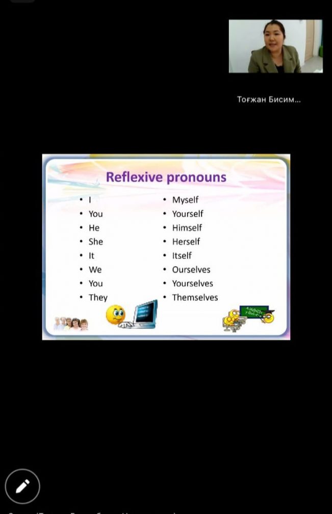 Бүгін, 04.12.2025 ж. "Тірек мектептер жобасы" аясында 8-сыныптарға ағылшын тілі пәнінен онлайн сабақ өткізілді. Сабақтын тақырыбы – Reflexive pronouns and each other.