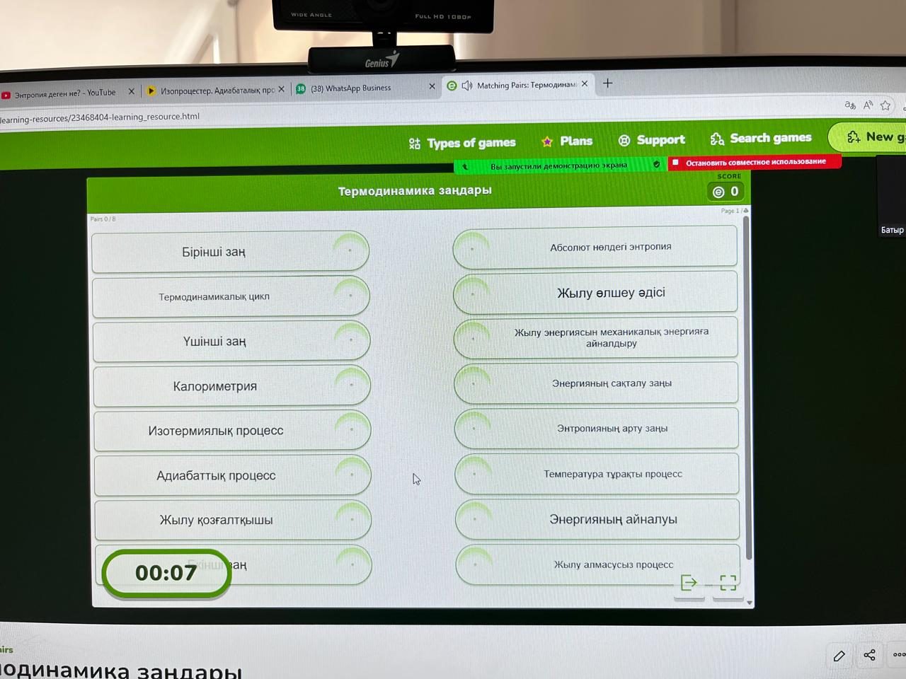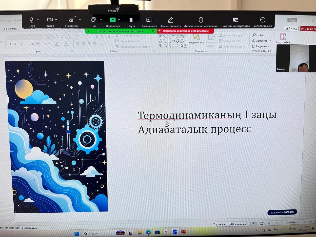 Бүгін, 9 желтоқсан күні, "Тірек мектеп" жобасы аясында 10-сыныпта физика пәнінен «Термодинамика 1 заңы, адиабаталық процесс» тақырыбында онлайн сабақ өтті. Сабақты өткізген: пән мұғалімі — Шаймардан Х.