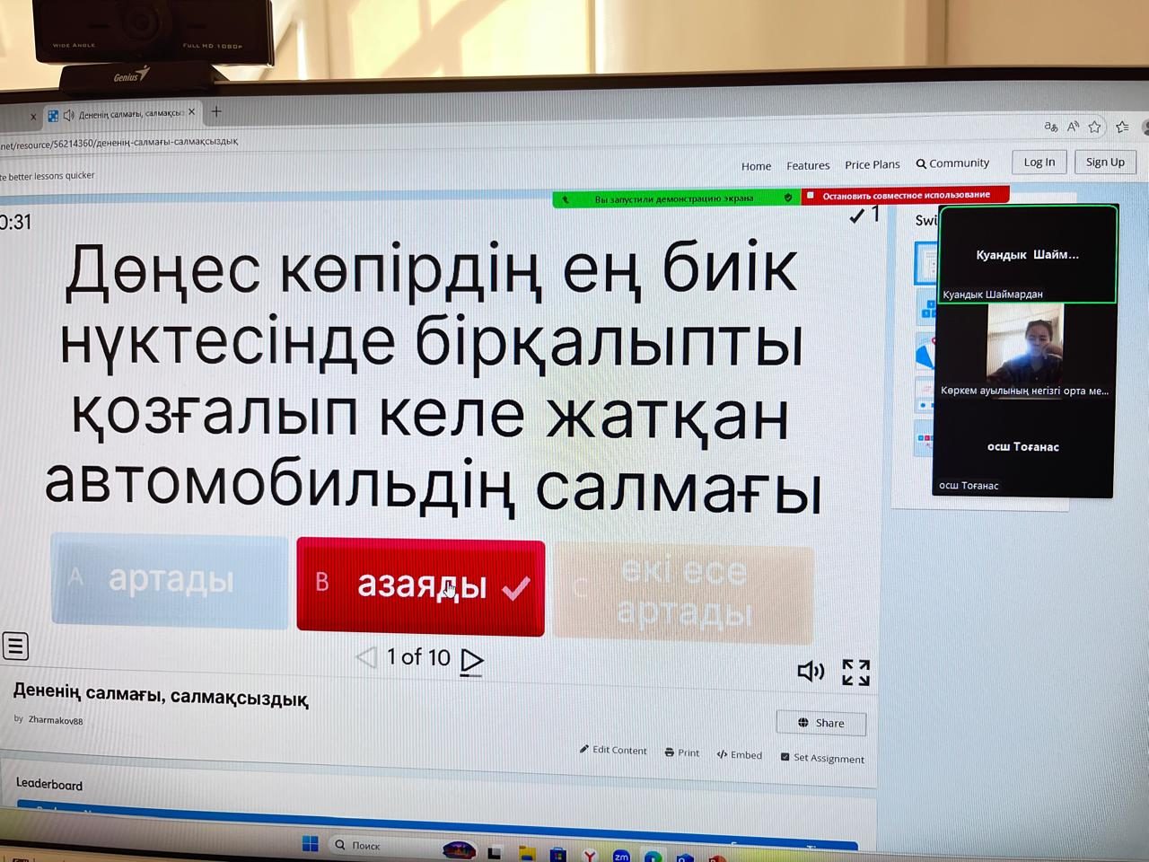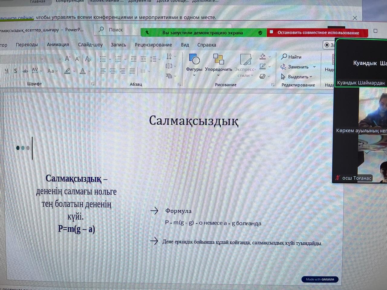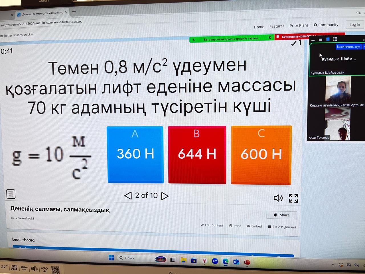 Бүгін, 10 желтоқсан күні, "Тірек мектеп" жобасы аясында 9-сыныпта физика пәнінен «Дененің салмағы. Салмақсыздық тақырыбында онлайн сабақ өтті. Сабақты өткізген: пән мұғалімі — Шаймардан Х.