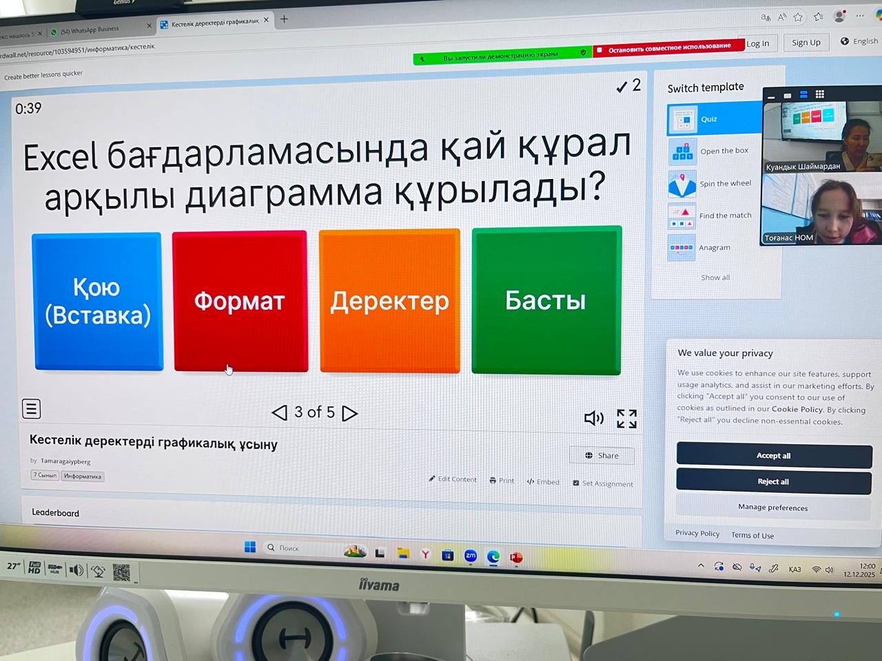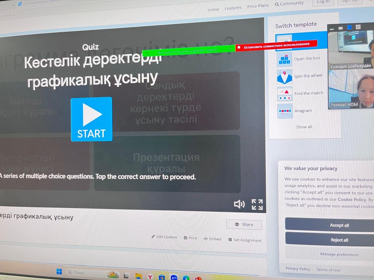 Бүгін, 12 желтоқсан күні, "Тірек мектеп" жобасы аясында 7-сыныпта информатика пәнінен «Кестелік мәліметтердің графикалық көрінісі» тақырыбында онлайн сабақ өтті.