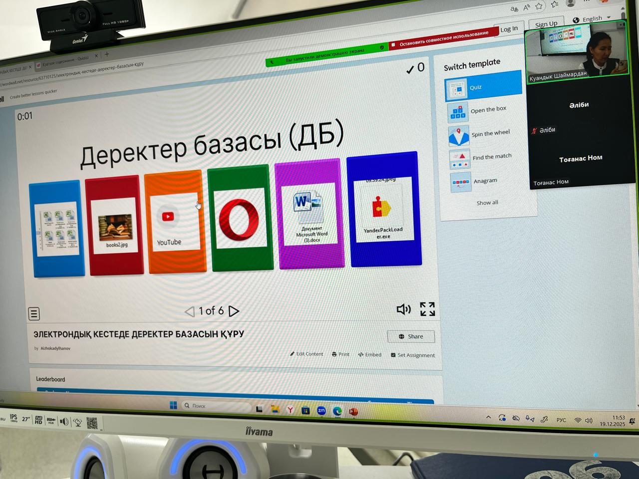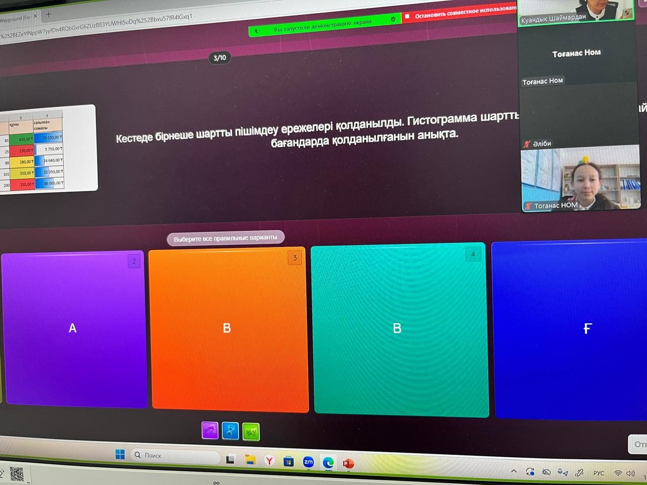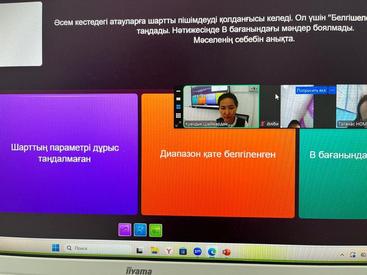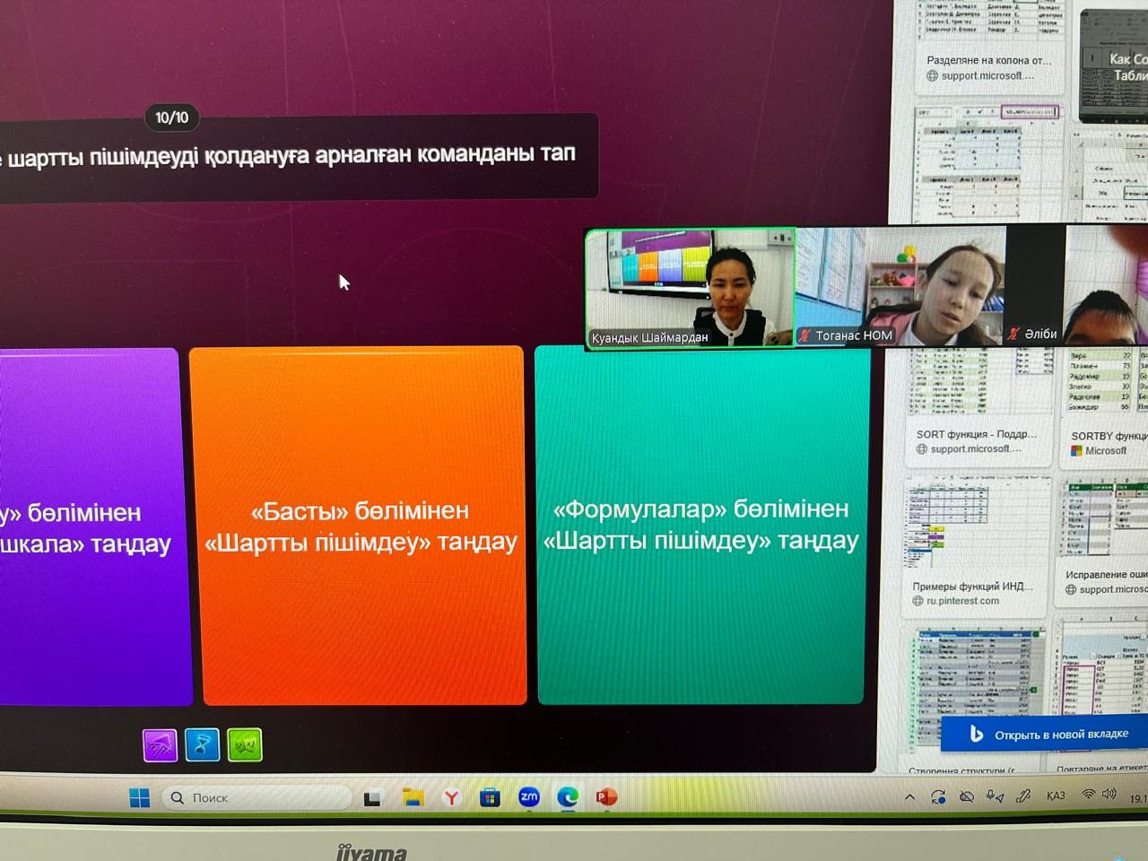 Бүгін, 19 желтоқсан күні, "Тірек мектеп" жобасы аясында 7 -сыныпта информатика пәнінен «Шартты пішімдеу» тақырыбында онлайн сабақ өтті. Сабақты өткізген: пән мұғалімі — Шаймардан Х.
