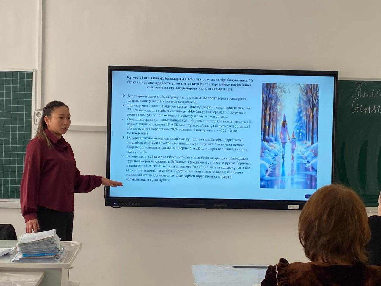Балалардың қысқы демалыс кезіндегі қауіпсіздігін қамтамасыз ету, жолда жүру ережелері, мұз үстіндегі қауіпсіздік, тұрмыстық және өрт қауіпсіздігі мәселелеріне ерекше назар аударылды.