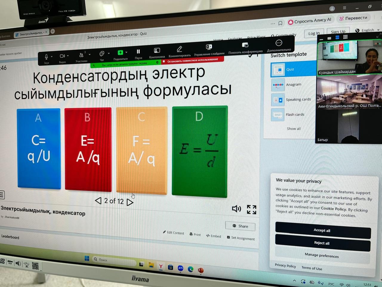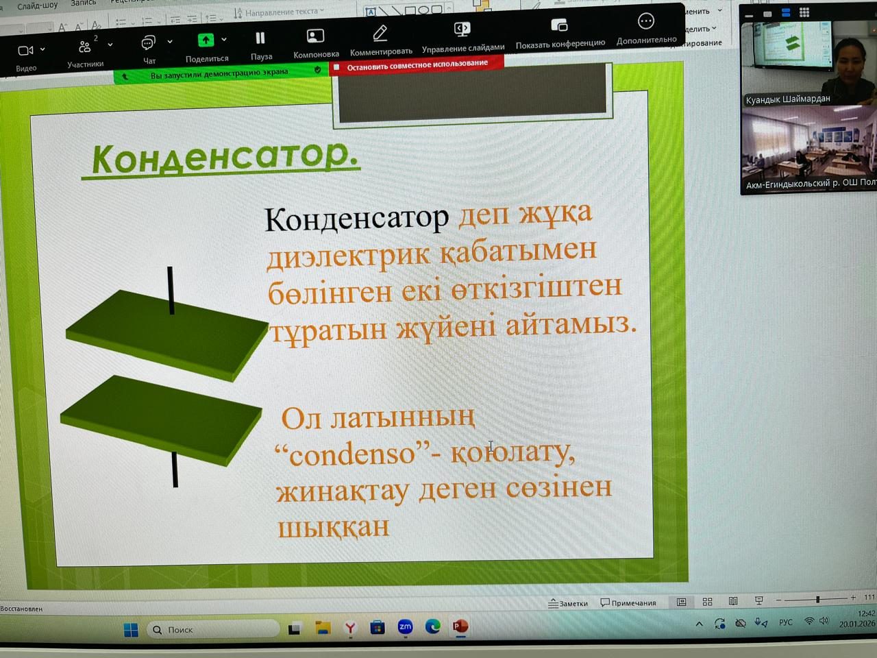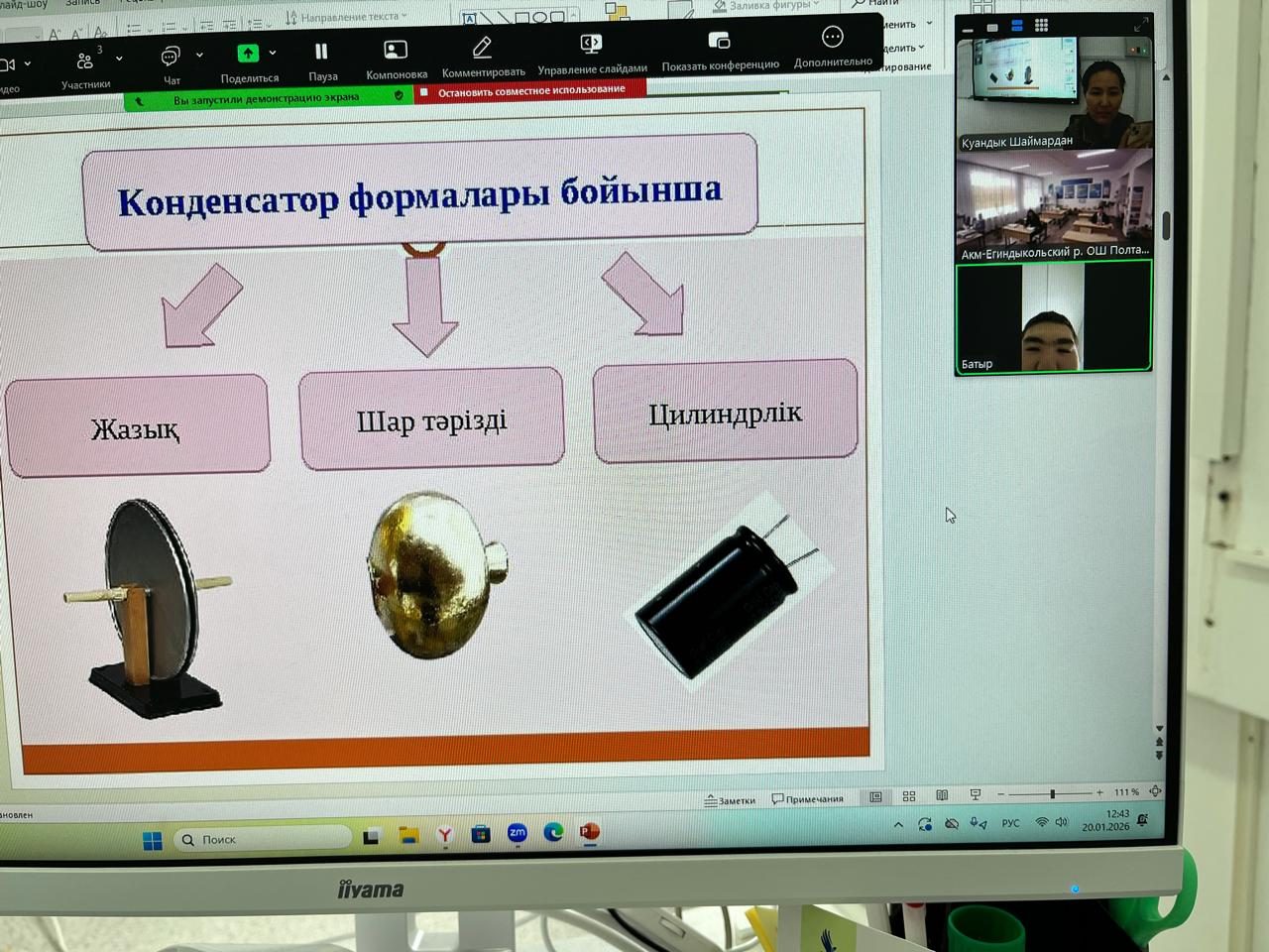 Бүгін, 20 қаңтар күні, "Тірек мектеп" жобасы аясында 10-сыныпта физика пәнінен "Электрсыйымдылық. Конденсатордың құрылысы мен түрлері" тақырыбында онлайн сабақ өтті. Сабақты өткізген: пән мұғалімі — Шаймардан Х.