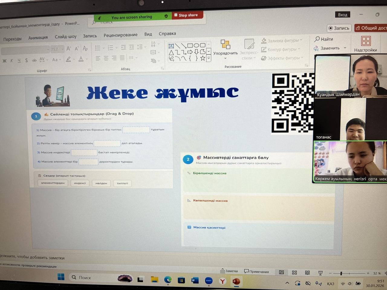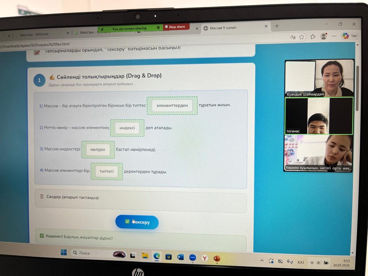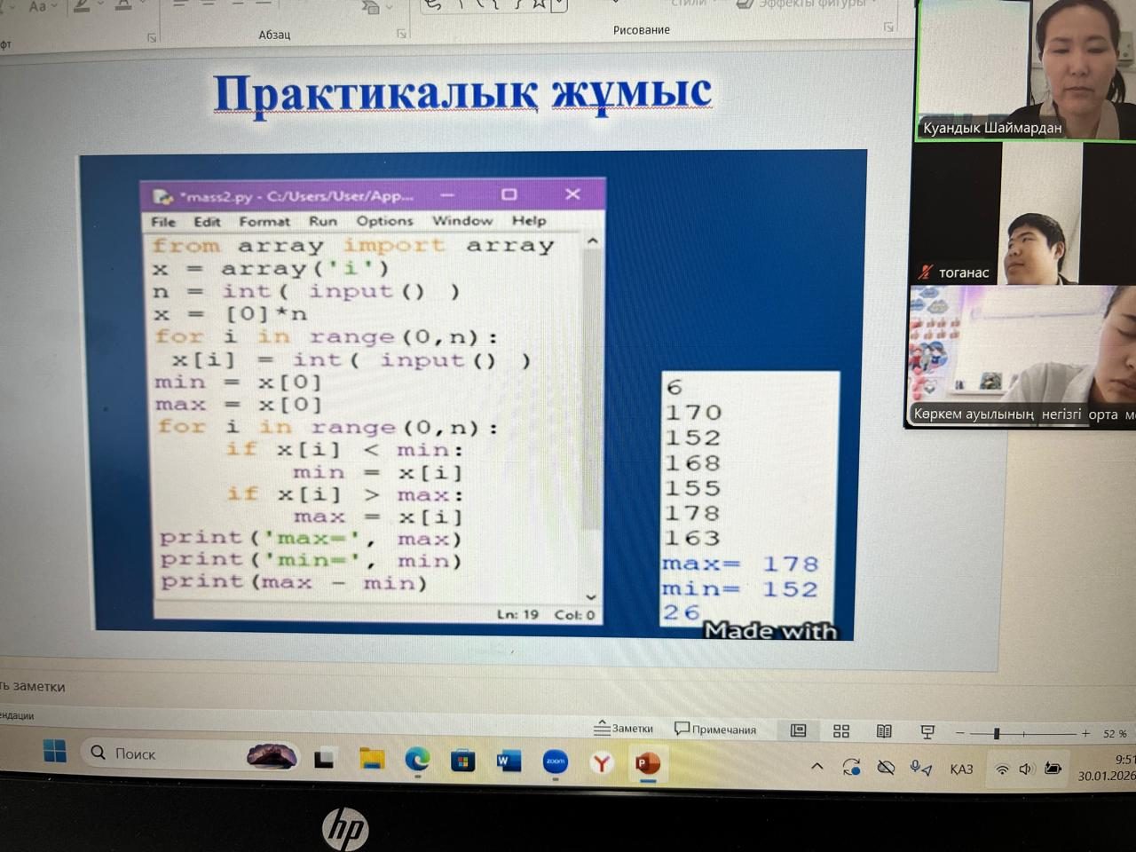 30 қаңтар 2026 жылы 9 сыныпта информатика пәнінен “Берілген қасиеттері бойынша элементтерді ізде ” тақырыбында онлайн сабақ өтті. Сабақтың мақсаты: “Python программалау тілінде шарттармен стандартты мәселелерді шешу. Сабақ барысында оқушылар әртүрлі тапсырманы орындап, белсене қатысты.