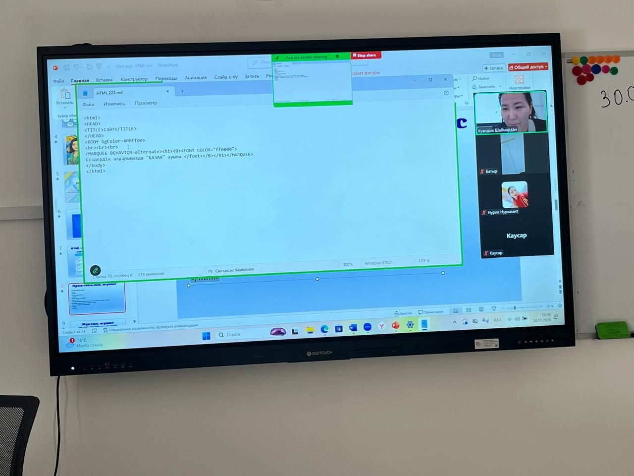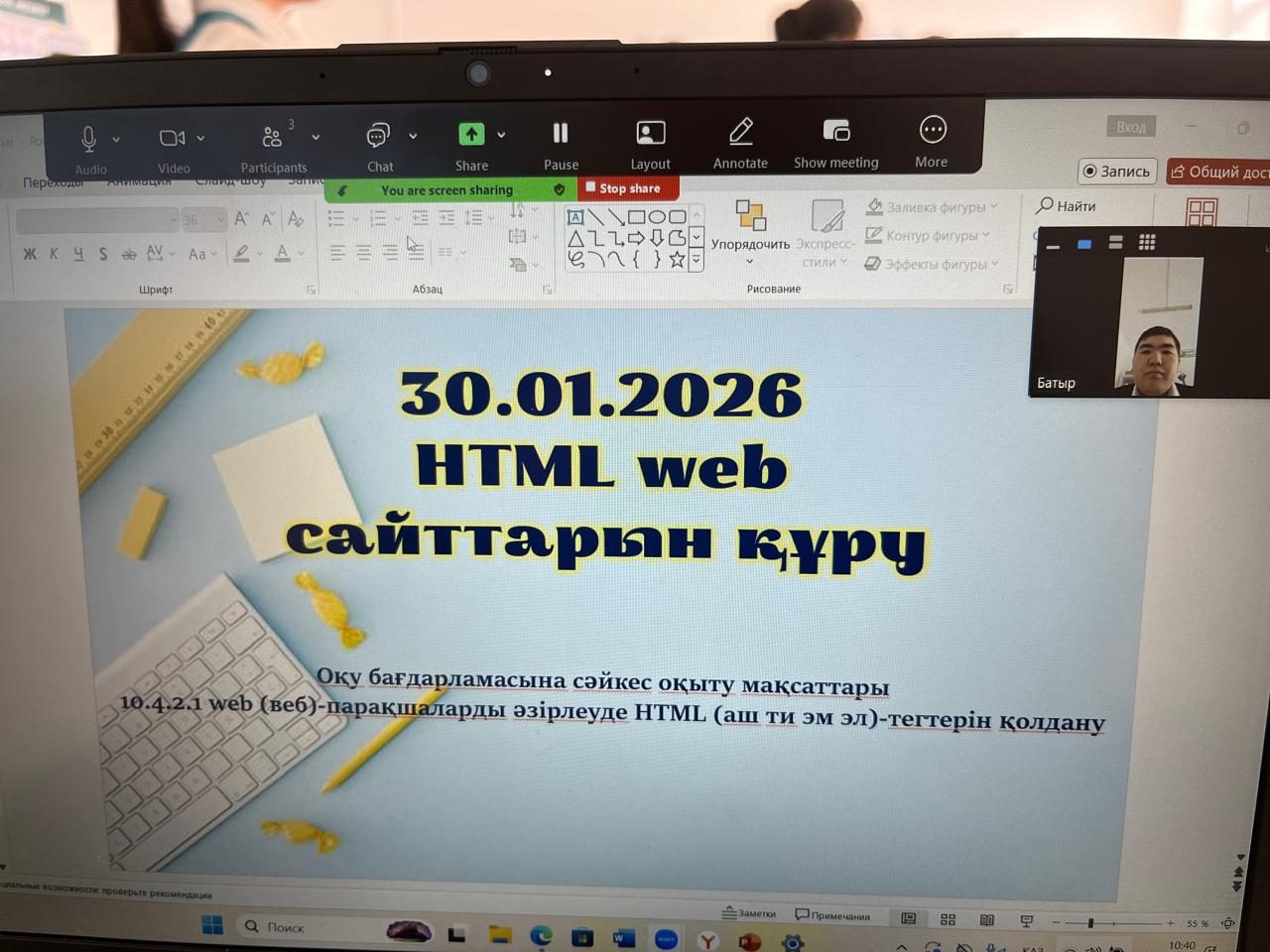 30 қаңтар 2026 жылы 10 сыныпта информатика пәнінен “ "HTML web сайттарын құру ” тақырыбында онлайн сабақ өтті. Сабақтың мақсаты: “Web-парақшаларды әзірлеу HTML терін қолдану. Сабақ барысында оқушы блокнотта қалай код жазу керек екенін түсінді, белсене қатысты.