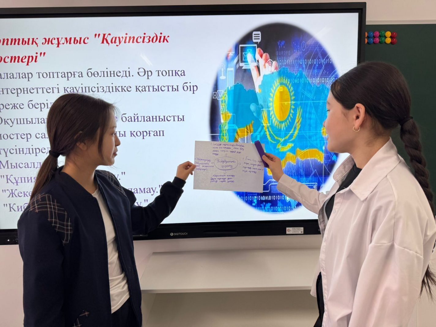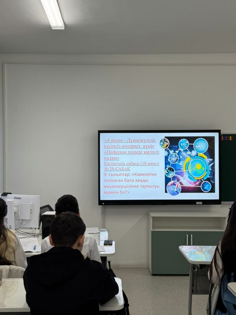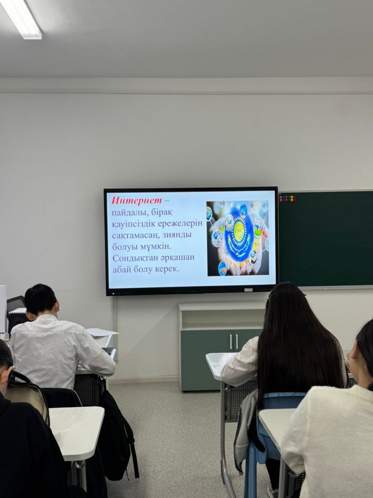Тәрбие сағатының мақсаты – оқушыларға интернет кеңістігін қауіпсіз пайдалану жолдарын түсіндіру, кибербуллингтен сақтану, жеке мәліметтерді қорғау және әлеуметтік желілерде дұрыс қарым-қатынас орнату дағдыларын қалыптастыру.Іс-шара барысында оқушыларға цифрлық қауіпсіздік ережелері түсіндіріліп, бейнероликтер көрсетілді, сұрақ-жауап жұмыстары жүргізілді. Сонымен қатар, түрлі жағдаяттар арқылы интернеттегі қауіп-қатерлерден сақтану жолдары талқыланды.