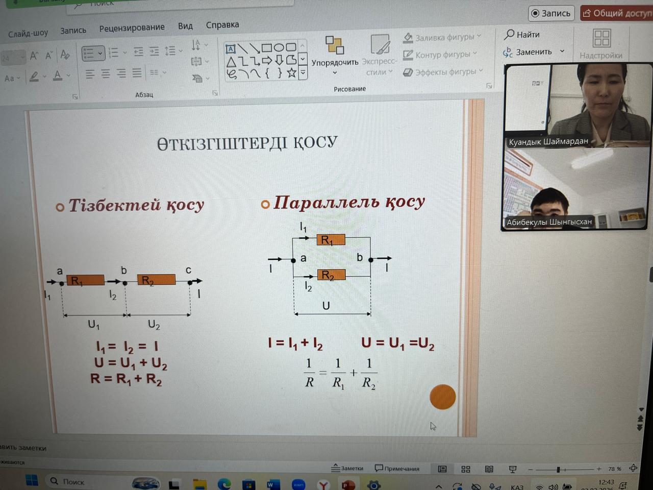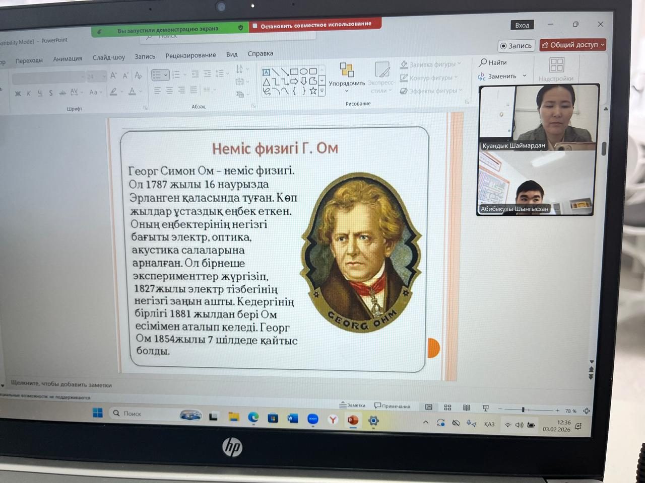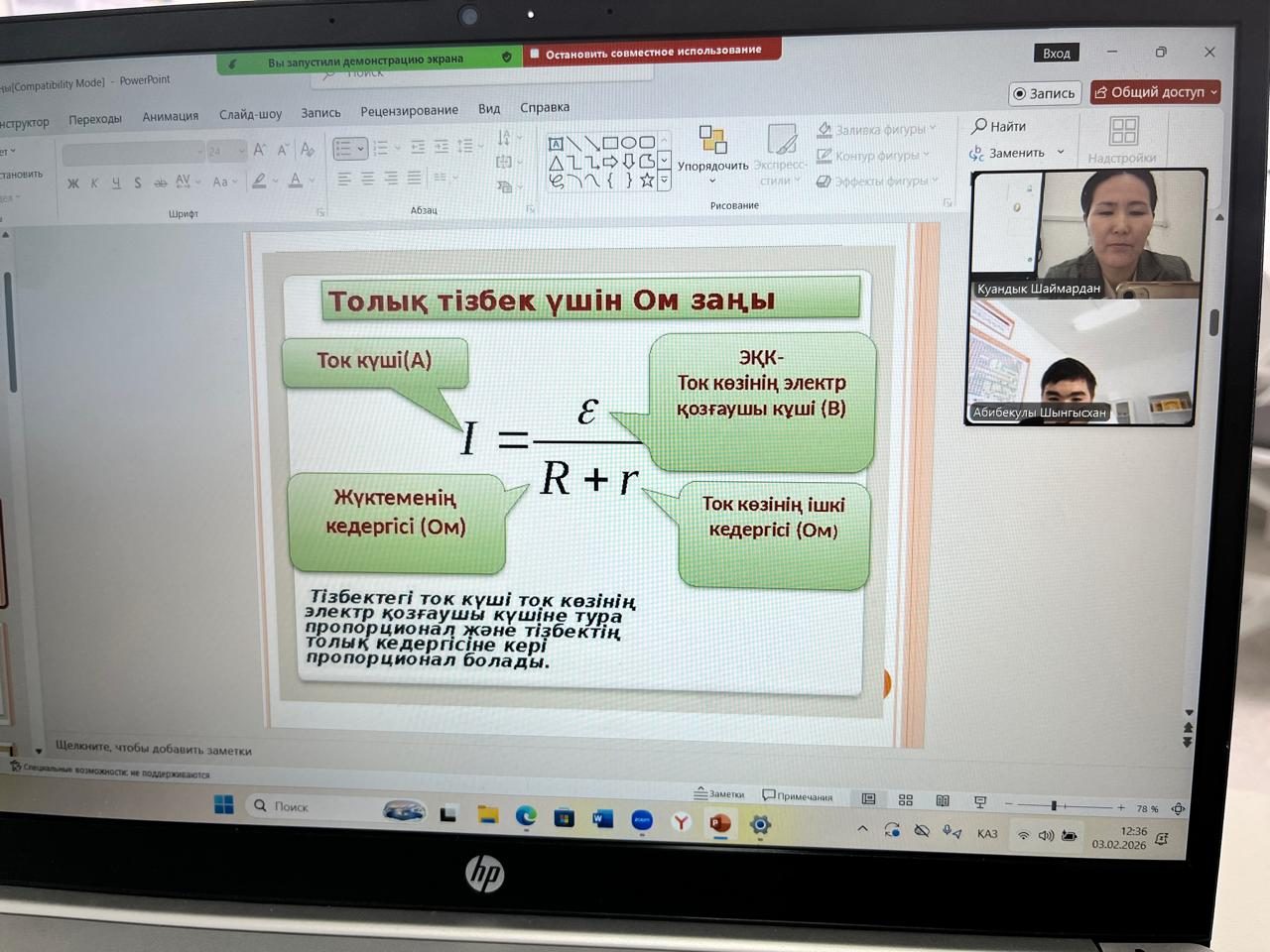 3 ақпан 2026 жылы 10 сыныпта физика пәнінен “Толық тізбек үшін Ом заңы “ тақырыбында онлайн сабақ өтті. Сабақтың мақсаты: “Толық тізбек үшін Ом заңын қолдану және қысқа тұйықталудың салдарын көрсету .Сабақ барысында оқушы есеп шығарып, әртүрлі тапсырманы талдап, белсене қатысты.