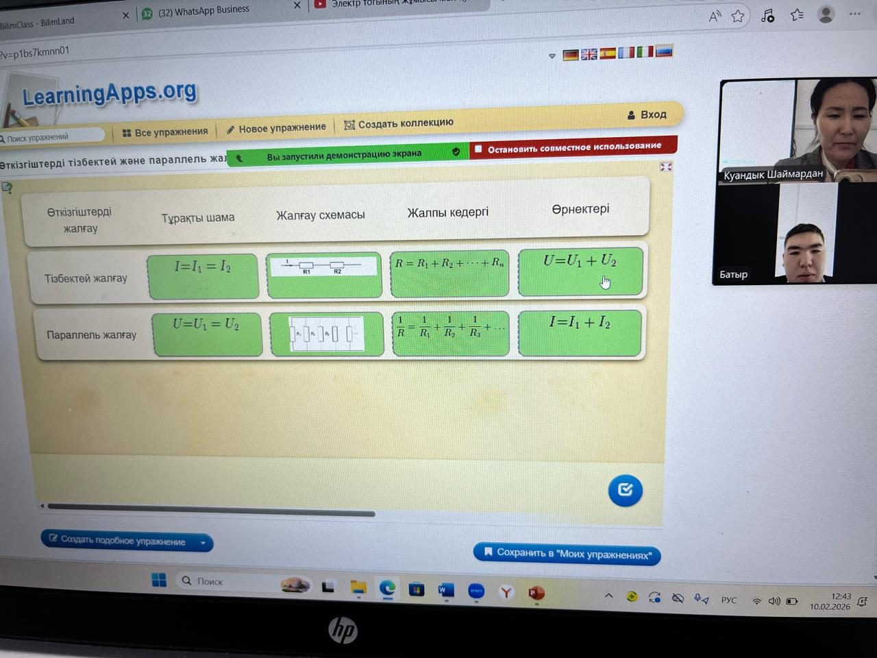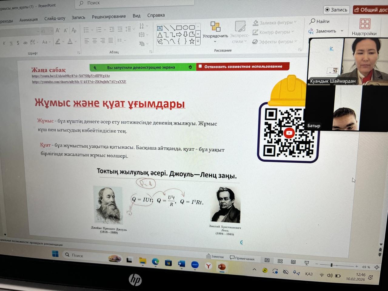 10 ақпан 2026 жылы 10 сыныпта физика пәнінен ""Электр тогының жұмысы мен қуаты" тақырыбында онлайн сабақ өтті. Сабақтың мақсаты: “Жұмыс және қуат формулаларын есептер шығаруда қолдану. Сабақ барысында оқушылар әртүрлі тапсырманы талдап, белсене қатысты.