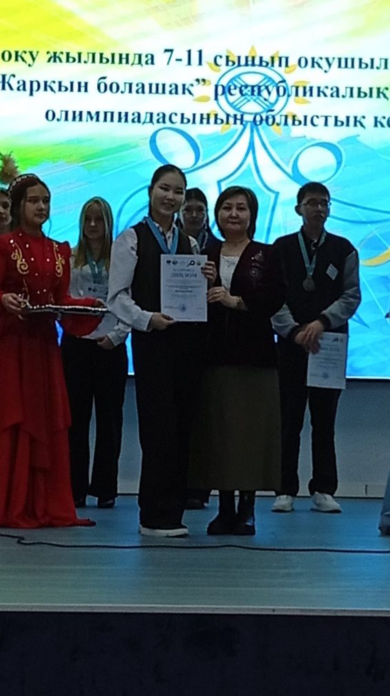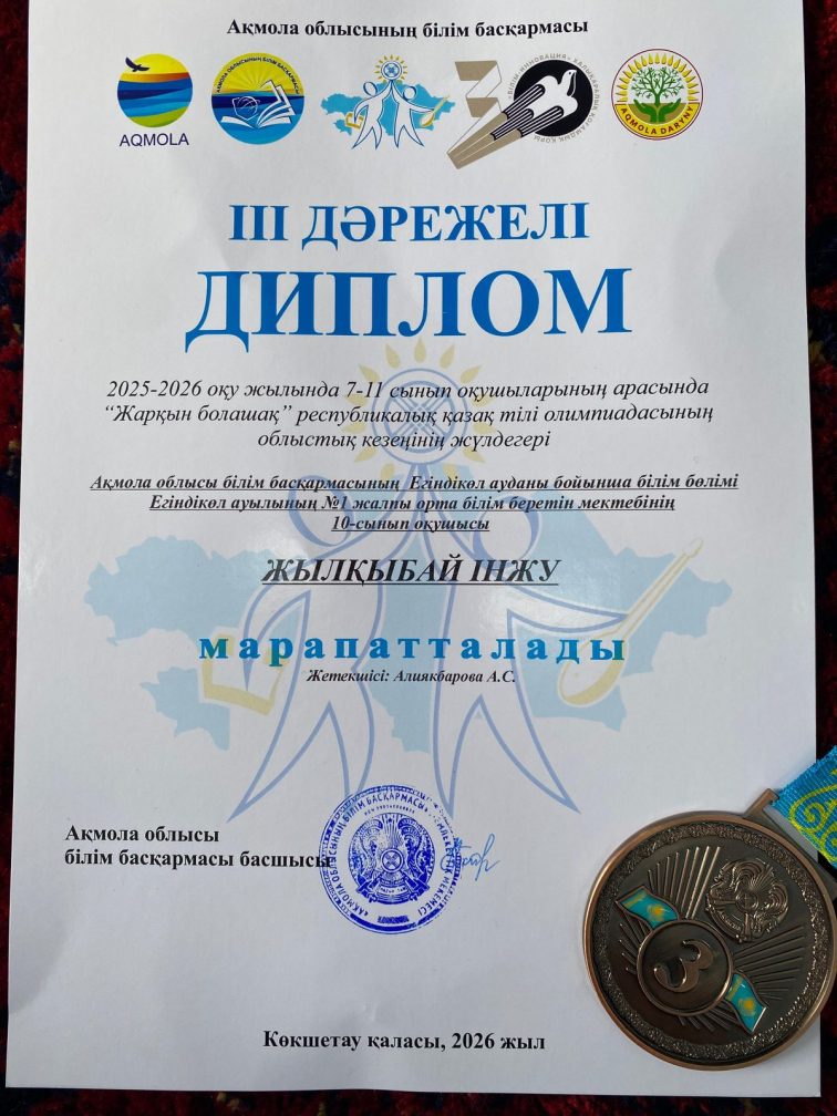 2025 - 2026 оқу жылында 7-11 сынып оқушыларының арасында " Жарқын болашақ" республикалық қазақ тілі олимпиадасының облыстық кезеңіне мектебіміздің 10-сынып оқушысы Жылқыбай Інжу қатысып, жүлделі 3 - орынды иеленді. Жеңісің құтты болсын!