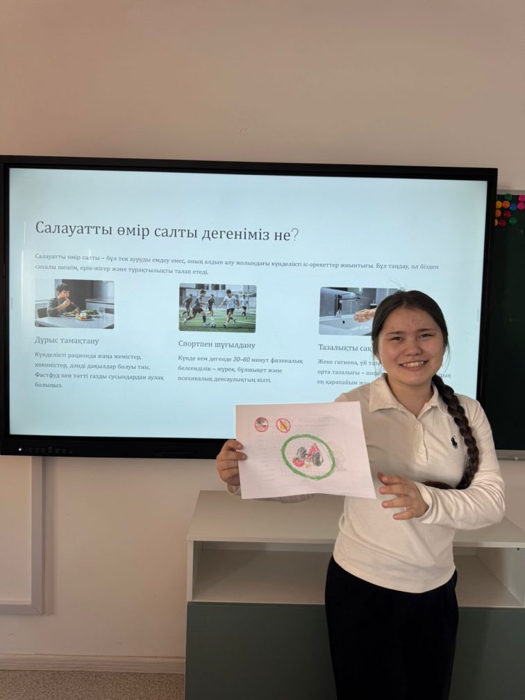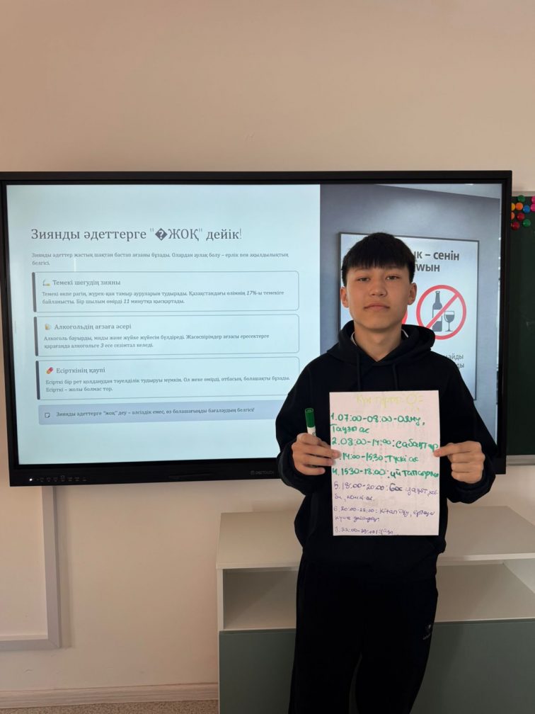 06.04.2026 күні 9 «А» сыныбында «Өмірге салауатты қадам» атты тәрбие сағаты өткізілді.Мақсаты: Оқушыларға салауатты өмір салтының маңыздылығын түсіндіру, зиянды әдеттердің (темекі шегу, алкоголь, есірткі) ағзаға тигізетін зиянын ұғындыру, денсаулықты сақтауға және нығайтуға баулу. Сонымен қатар, оқушылардың дұрыс тамақтану, спортпен шұғылдану, жеке бас гигиенасын сақтау дағдыларын қалыптастыру және жауапкершілігін арттыру.