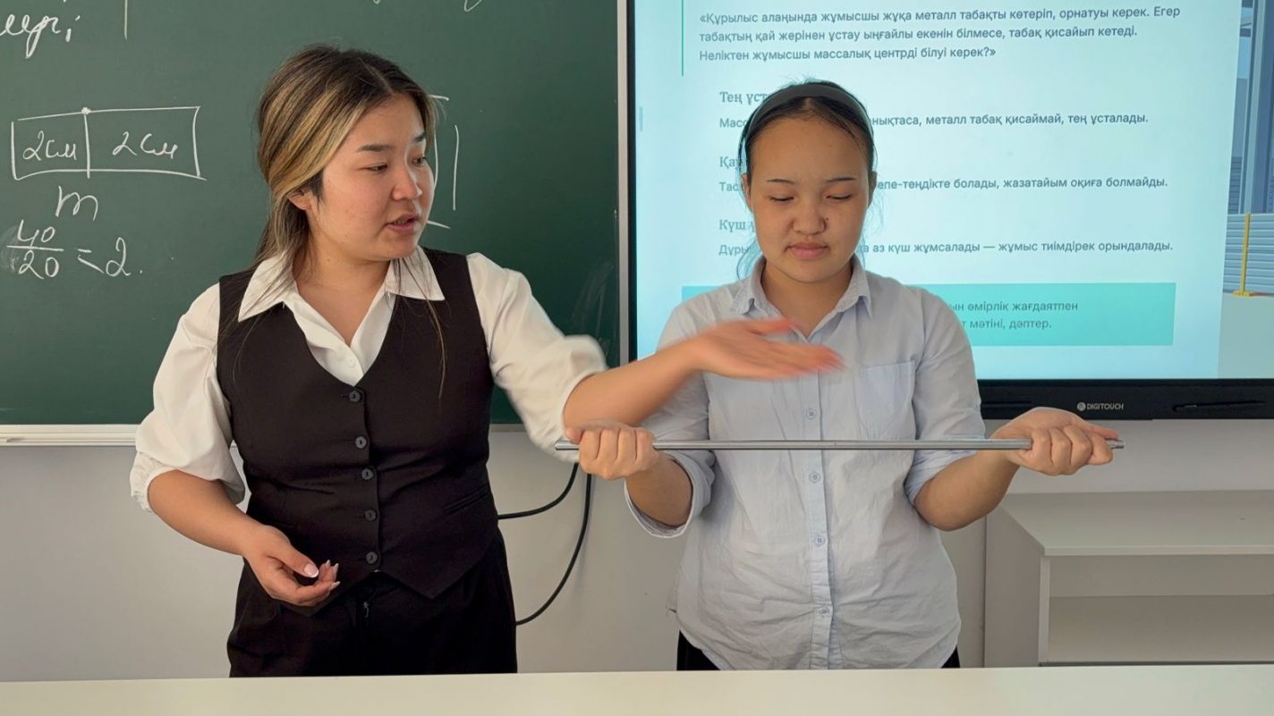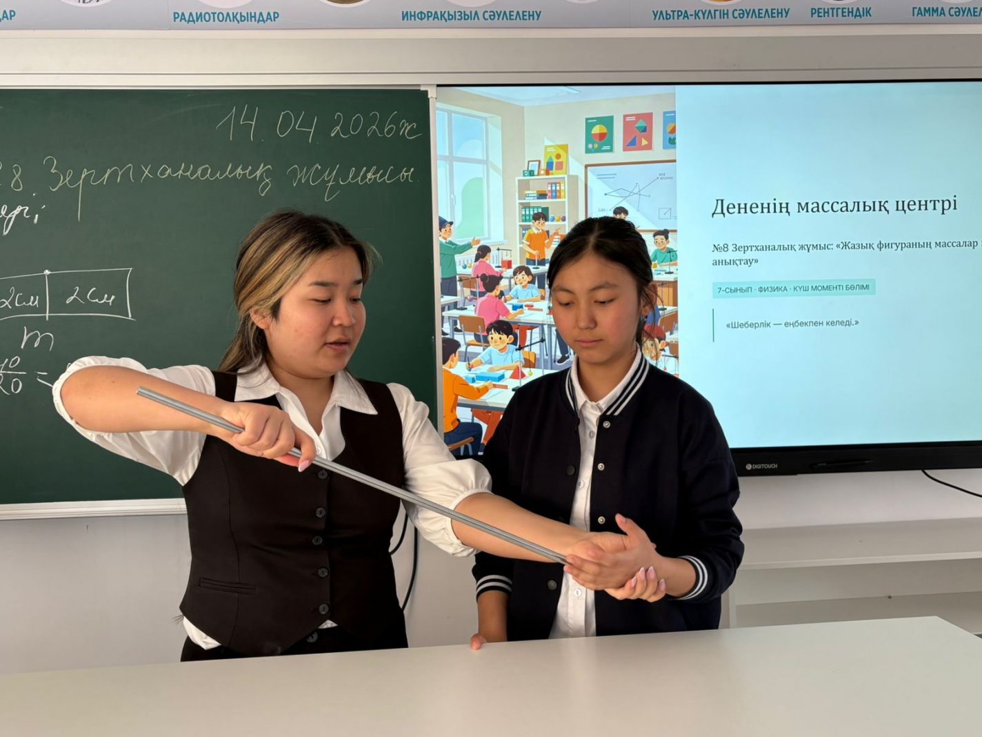 Зертханалық жұмыс барысында оқушылар дененің массалық центрін анықтау әдістерімен танысып, тәжірибе жасап, өз білімдерін практикада қолданды 🧪📐