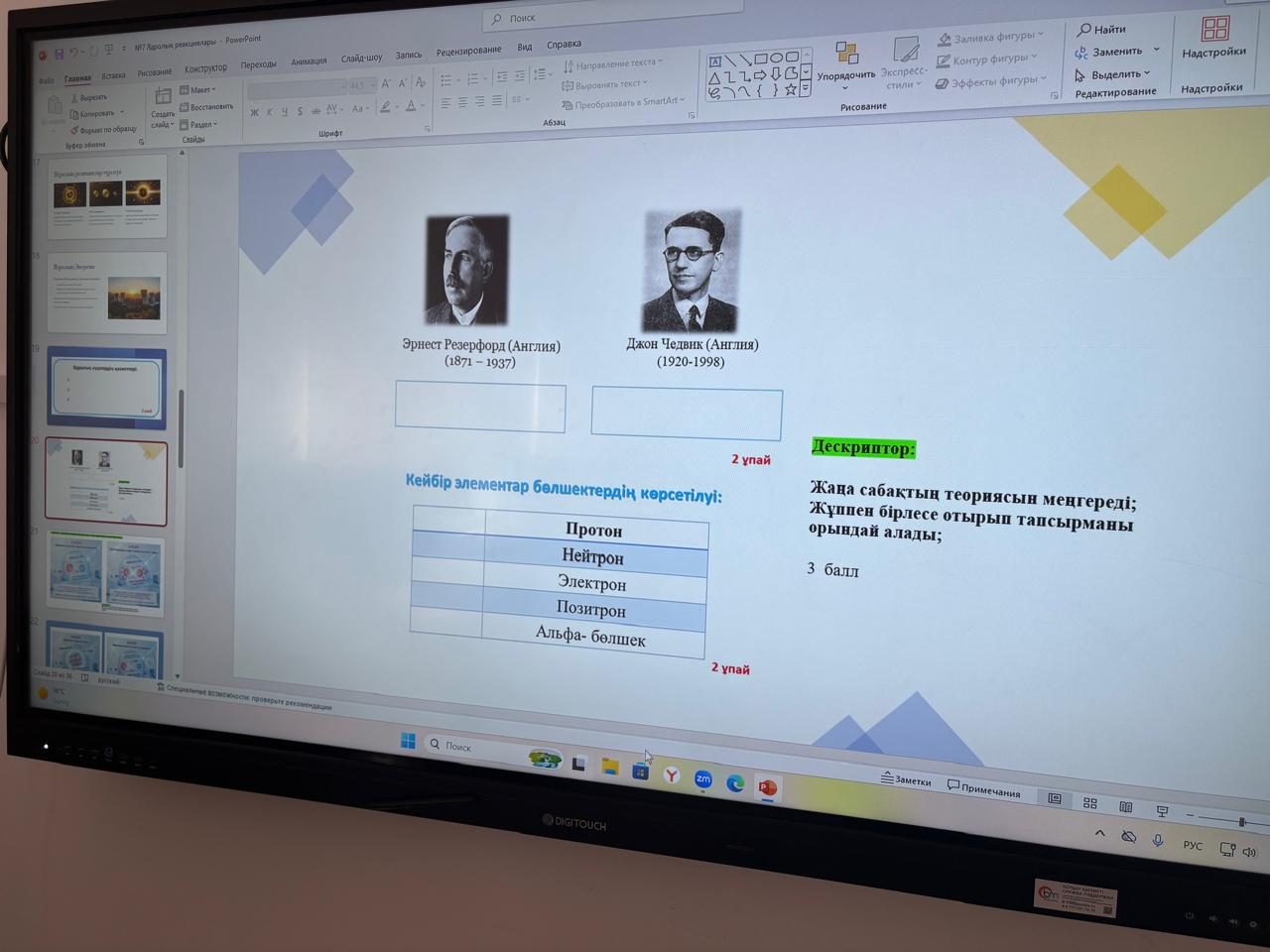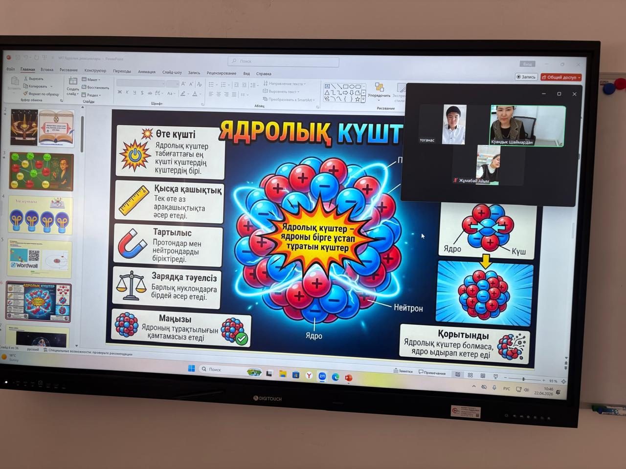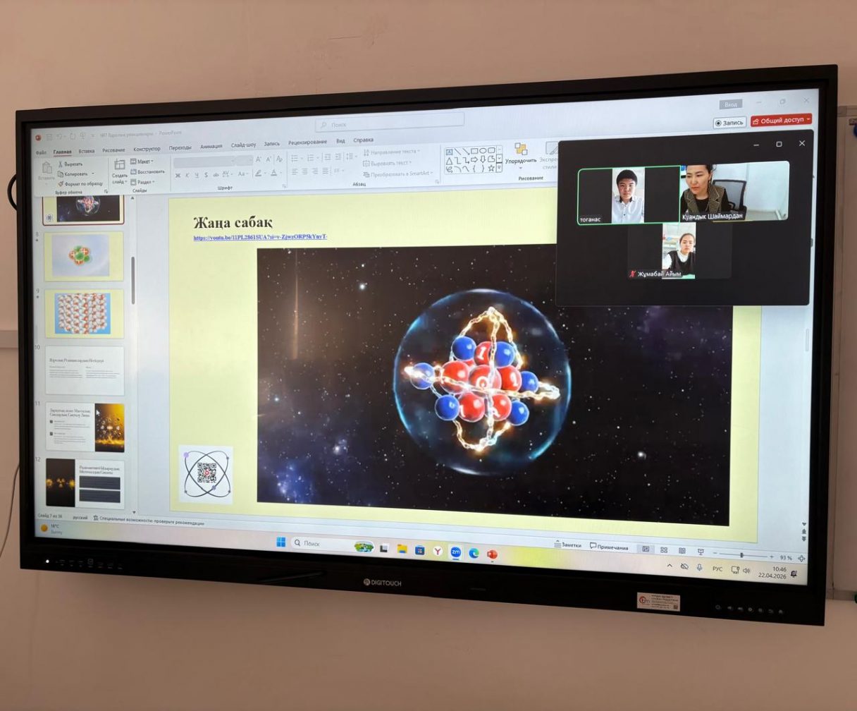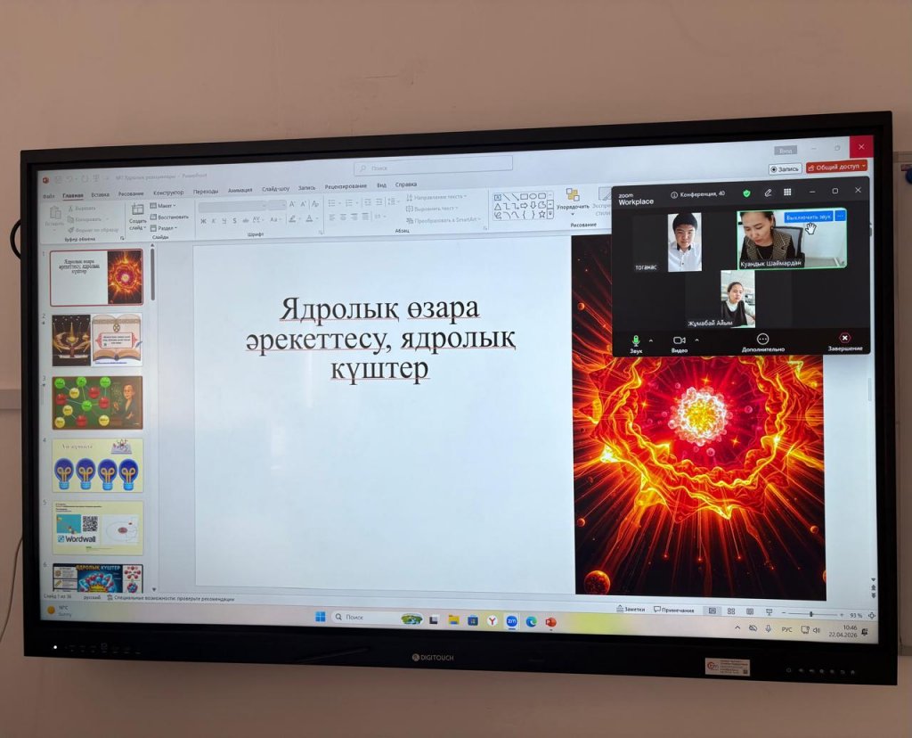 22 сәуір 2026 жылы 9 сыныпта физика пәнінен "Ядролық өзара әрекеттесу, ядролық күштер" тақырыбында онлайн сабақ өтті. Сабақтың мақсаты: «Ядролық күштердің қасиеттерін сипаттау» . Сабақ барысында оқушылар әртүрлі тапсырманы орындап, есеп шығарды, оқушылар белсене қатысты.